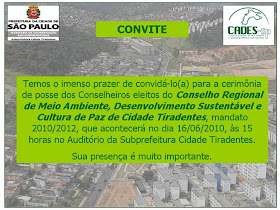 A eleição do Conselho Regional de Meio Ambiente, Desenvolvimento Sustentável e Cultura de Paz (CADES), realizada no dia 30 de maio, das 9 às 16 horas, na Subprefeitura de Cidade Tiradentes elegeu os conselheiros que participarão das decisões em relação à política pública do Meio Ambiente na região.